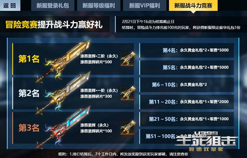 活动规则:结算时,冒险战斗力排名前100名的玩家,将获得新服限定豪华礼包1份,最高可以领取永久黄金武器-“涤罪圣辉·二阶”!排行结算后,7个工作日内,将发放奖励到获奖玩家邮箱,请注意查收!