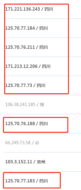 请问这几个IP段到底是做什么的?从网站上线大概两个多月,天天7*24小时都在网站里不挺的爬行。。。我用禁掉这些IP段也可以。。。但是只要一解封,一会儿又来了,感觉不像是采集。。。如果是采集我觉得应该早采集好了啊,这几个IP真的是不停的,24小时的。。。好奇怪,求大神解释(倒数第二个贵州的那个IP段和四川的也一样,也是7*24小时在网站里爬了2个多月了。。。)