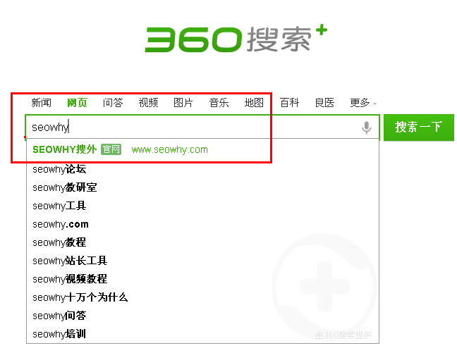 如题:360搜索下拉框直接展示官网和域名免去用再次搜索,点击下面绿色下拉,直接调转到官方网站。