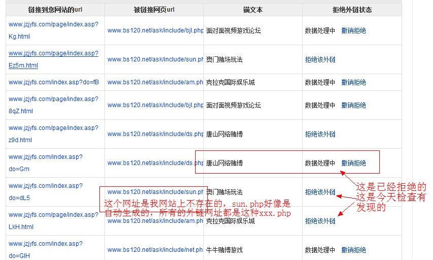 ###我公司买来的旧域名,自带一堆垃圾外链,只好挨个去点拒绝外链。但是两个月过去了,百度没有删掉这些外链,前几天刚又点了一遍。