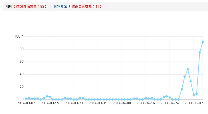 百度站长工具异常抓取工具显示错误页面有两种,1、404错误页面,2、其他错误页面。最近两天网站404错误页面的数量增加的有点多。