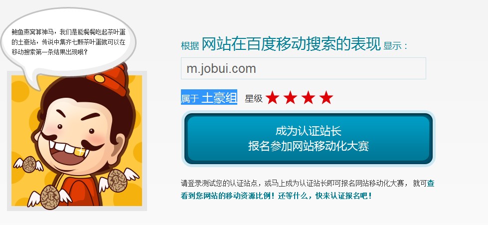 [导读]:百度站长平台推出有趣的活动《2014网站移动化大赛》 http://zhanzhang.baidu.com/act/mobilespeed/search?site=m.jobui.com 我网站属于:土豪组 移动互联网的浪潮席卷而来,我们现在的中小企业...