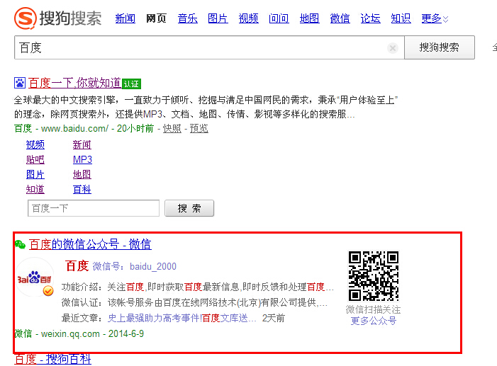 搜狗也有大动作了,加入tx的大数据之后,创新在搜索结果中加入相关的微信公众账号!这个对于微信营销的同学来说,算不算给力呢~~