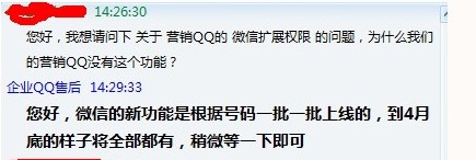 ###营销QQ用途还不错的,不过这个微信扩展目前正如楼主所说的是个鸡肋,只能看不能回复,就是多了一个移动门户微官网设置,而且需要扩展还涉及其他费用。