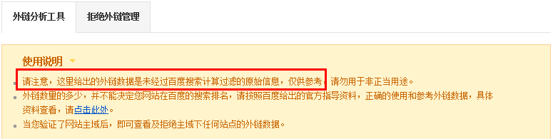 百度站长的外链分析工具,只是百度一定的周期公布出“未经百度搜索计算过滤的原始数据”。