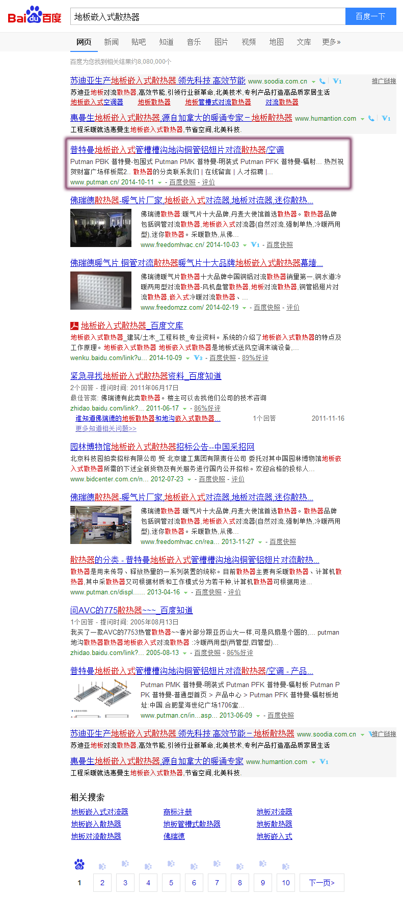 我觉得这个问题是关键词权重匹配的缘由,地板嵌入式散热器,我看到首页并没有完整的网页标题,基本都是分词匹配来的,为什么它的首页排在第一,观察发现它的匹配度似乎更强一些,因为它的“地板嵌入式”在前,而“散热器”在后,更加精准。余下的除了百度的产品基本都是散热器在前,这个匹配就不如它的精确了。如图:
