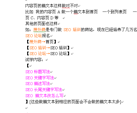 内容页的描文本这样做对不对 比如 我的内容页A做一个描文本到首页 一个到列表页 一个活几个岛内容页B、内容页C、内容页D等 其他的页面也这样 如:搜外网是专门做SEO培训的网站,现在已经培养了几万名学员了。要学习SEO请到SEO论坛报名