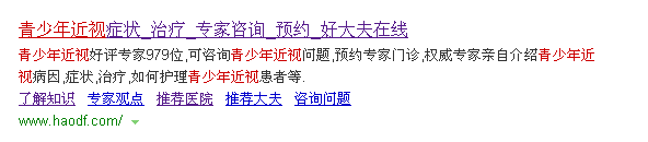 [导读]:搜索"青少年近视" 好大夫在线网内页出现子链, 出现的子链的原因是什么? 好大夫 似乎和百度有特殊合作关系。 很多内页都有这样的导航链接。 ### 有时候还是觉的搜狗好,我的...