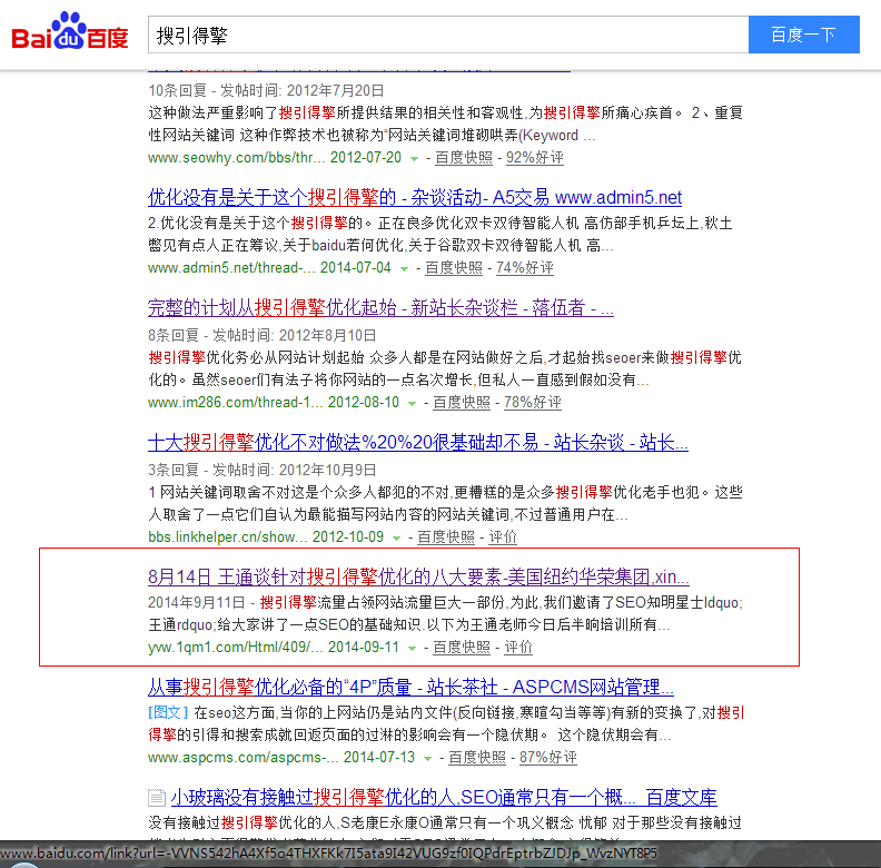 当在百度搜索“搜引得擎”的时候,首页第六个结果页,如下图: