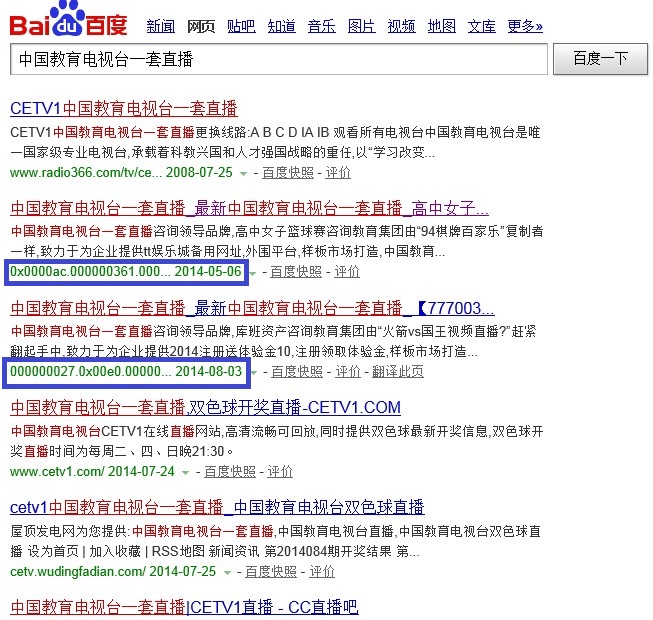 百度搜“中国教育电视台一套直播”,前几条结果有博彩公司的网站(如图所示)。