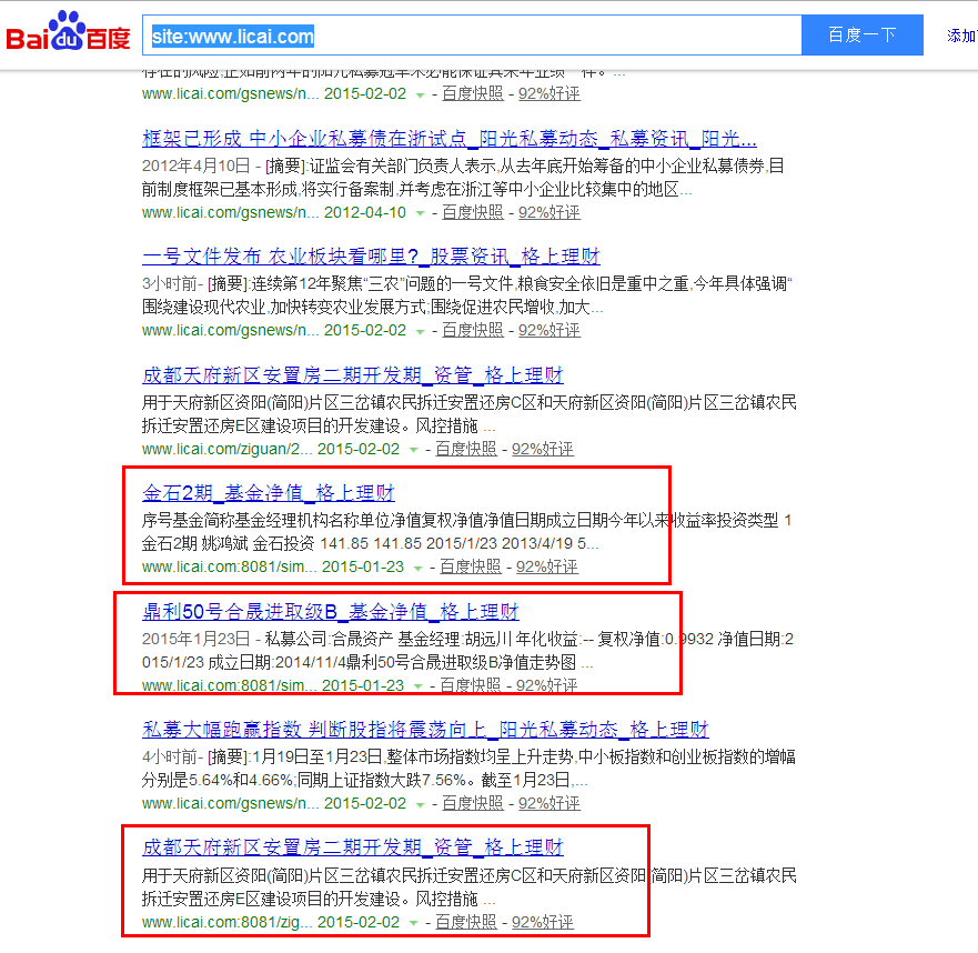百度,site@@www.licai.com@@,搜索设置选择时间,最近一天。收录的页面地址里面有好多都带有@@www.licai.com@@:8081/页面地址/