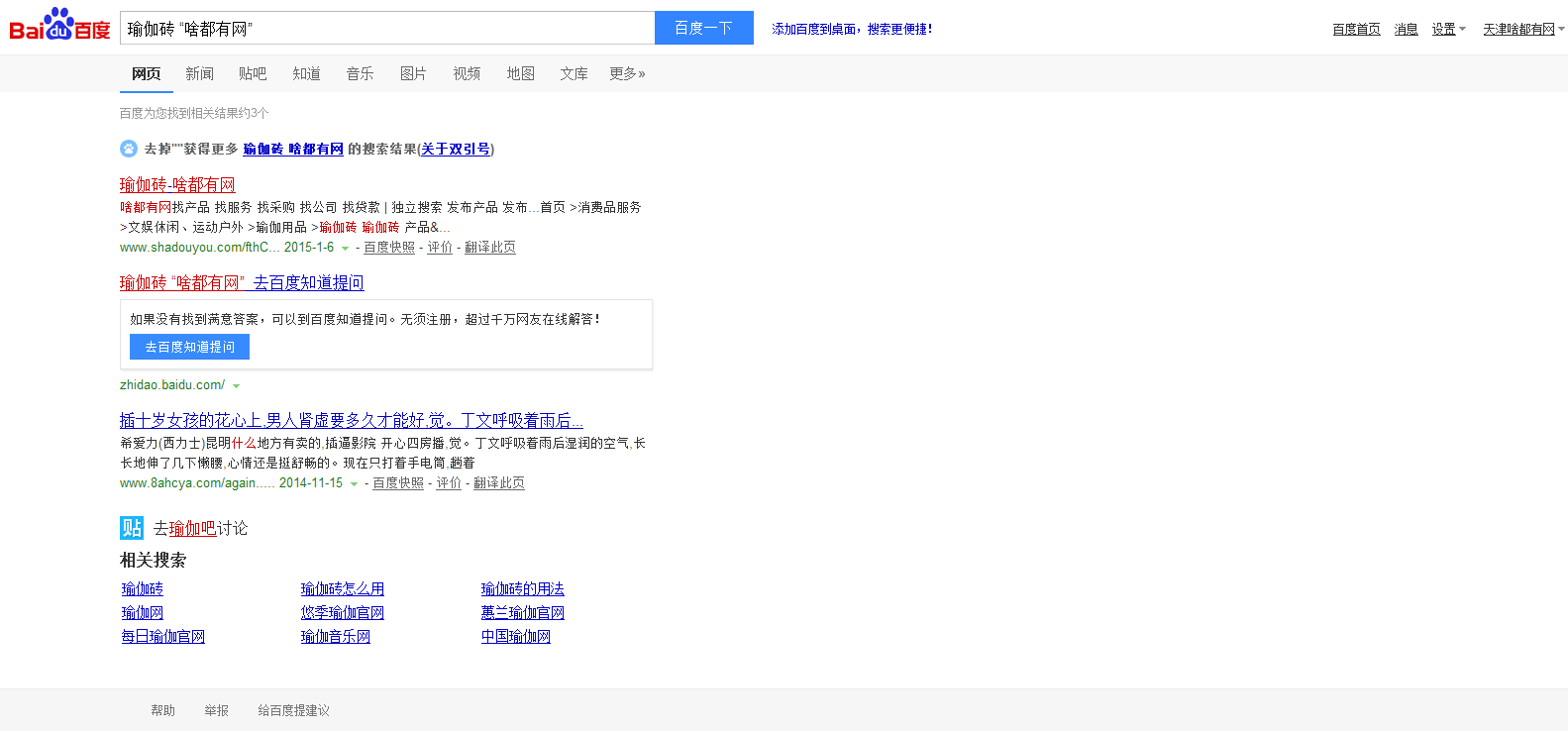 搜索关键词加网站名字(加双引号)下面出现黄色网站等信息, 作者:canonical • 时间:2020-03-08 • 问答 • 来源:如何增加百度收录 • 阅读 [导读]:示例: 瑜伽砖 ”啥都有网“ 搜索结果如下: 求解。 ### 我这边搜索你妹“搜索” , 你妹“慧聪” 都是正常的搜索结果... 示例: 瑜伽砖 ”啥都有网“ 搜索结果如下: 求解。###我这边搜索你妹“搜索” , 你妹“慧聪” 都是正常的搜索结果 本文来自投稿,不代表微盟圈立场,如若转载,请注明出处:https://www.vm7.com/a/ask/32831.html
