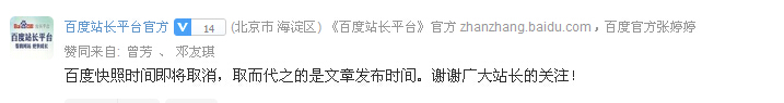 针对此事我还写过文章,百度不一定会取消百度快照,但一定会淡化快照日期。至于选用文章发布日期,这个感觉很靠谱,实效性