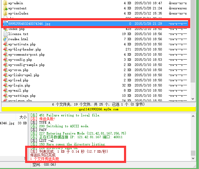 ###这个问题很简单,用FTP右键刷新下,然后把那个0Kb的删除,在重新上传就OK了
