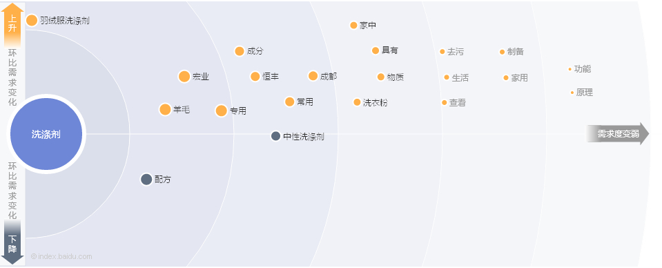 ###以你这张图看很好理解啊。你搜索的是洗涤剂,围绕这个词从里往外搜索量依次降低。黄色的代表近期有上升趋势,灰色的是下降趋势。越往上,上升趋势最明显,因为冬天来了所以羽绒服洗涤剂上升趋势很大。此外圈大的比圈小搜索量大。