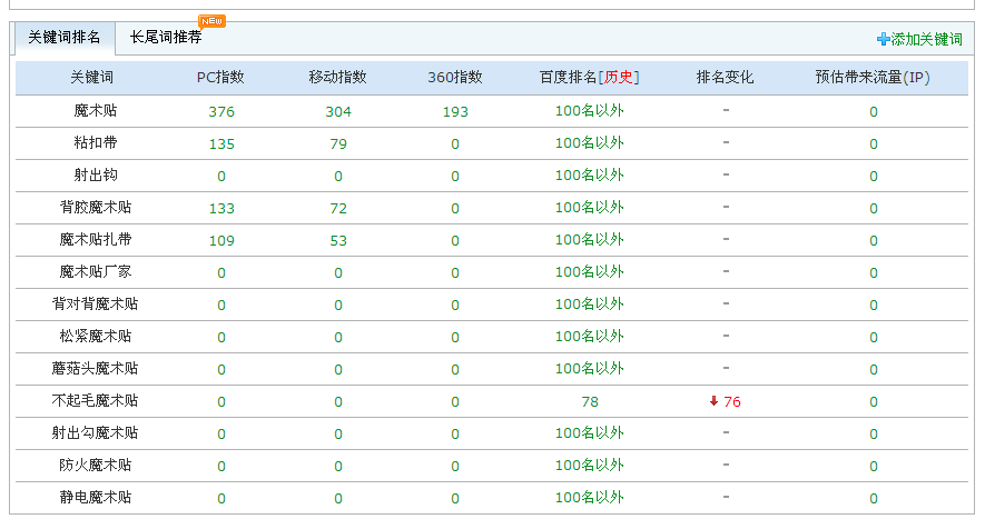 我的网站原来魔术贴的排名是在20多名的,今天6月2日一查,排名全部下降至100名以外。请大家帮我看看!