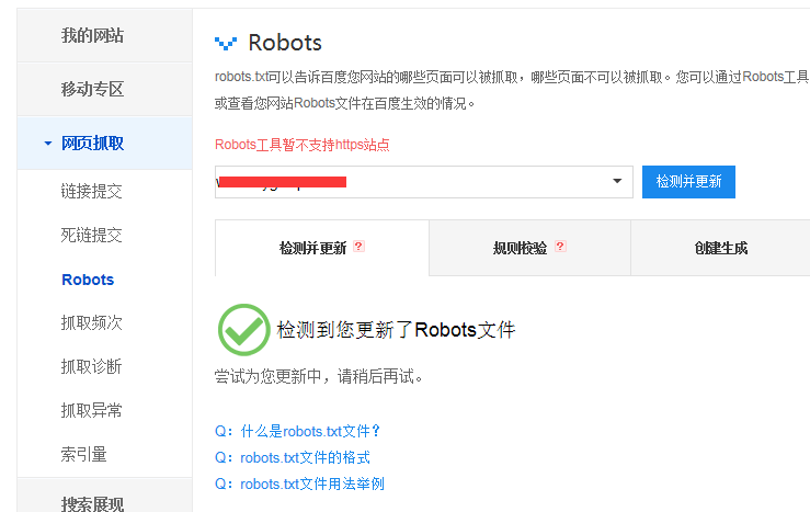一直提示检测到您更新了Robots文件 没有抓取是怎么回事。已经好几天了,别的站正常。就一个站 。