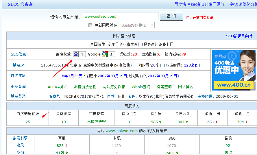 [导读]:法律行业8年老网站,上个月刚改版完成,想问问大家有没有什么好的推广渠道和引流方式?能够将流量给拉上来。。现在权重1,@@www.solvso.com@@如图所示: 首先我只是个菜鸟,简...