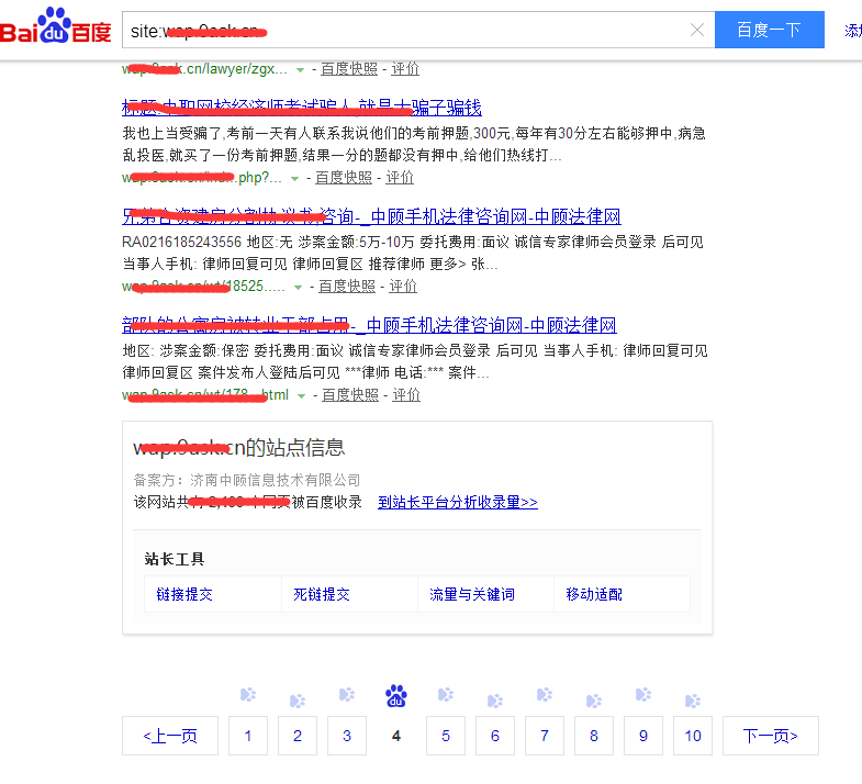 [导读]:百度site信息在首页显示,在第四页的时候又出现了 显示了两次,是什么原因? 并且第4页的显示还占据了一条数据的位置 谁遇到过这种情况? 我的网站也是这样,在底部也出现...