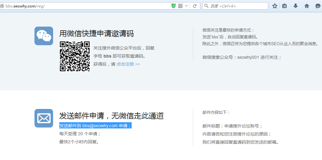 您好,获取搜外论坛注册邀请码 ,方法1:关注搜外微信公众号:seowhy001 后,发送 BBS 即可获得。 方法2:如果没有微信 也可以通过邮箱发送邮件到 bbs@seowhy.com 申请邀请码。
