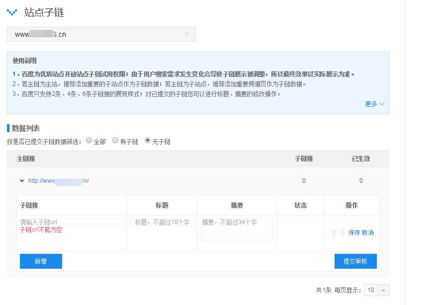 [导读]:一个不小心申请到了一个站点子链的权限 ,不知道怎么设置 有什么要求;对填写的内容有什么规定; 就按照要求填写子链接,标题,描述就可以了,子链接可以是二级域名,也...