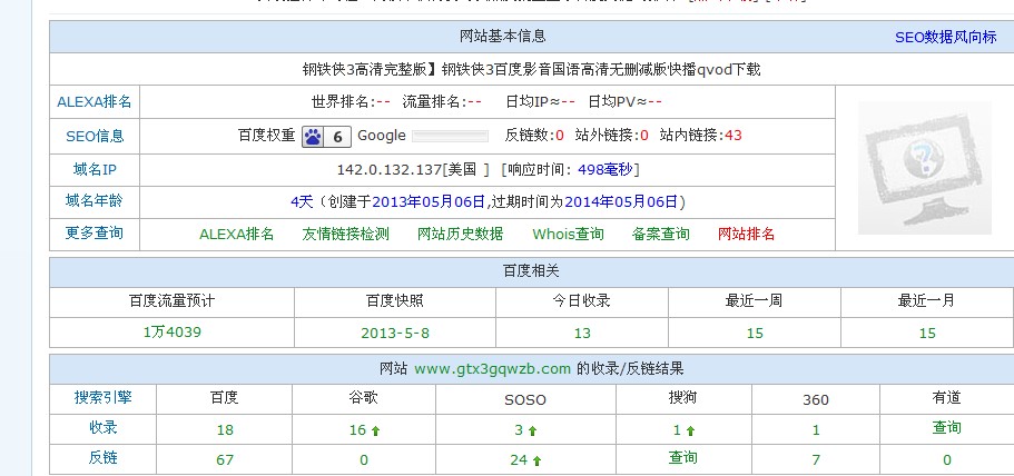 百度权重是第三方人造的,其关联的因素最重要的就是关键词的排名。此网站的“钢铁侠”是热词,如果相关排名靠前且多,那么权重就会很高。不过这种捞一把流量就废的网站,您也别指望能活多久。