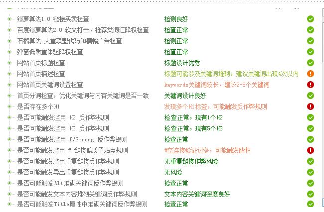 首先不得不说,金花站长工具还是不错的。百度算法、反作弊检测、以及常规的标签检测、网站安全检测,都包含在内。可谓是精细化之最。但是工具并非都很准确因为牵扯到,工具的更新以及识别问题,所以检测出来的作为参考进行去完善网站。