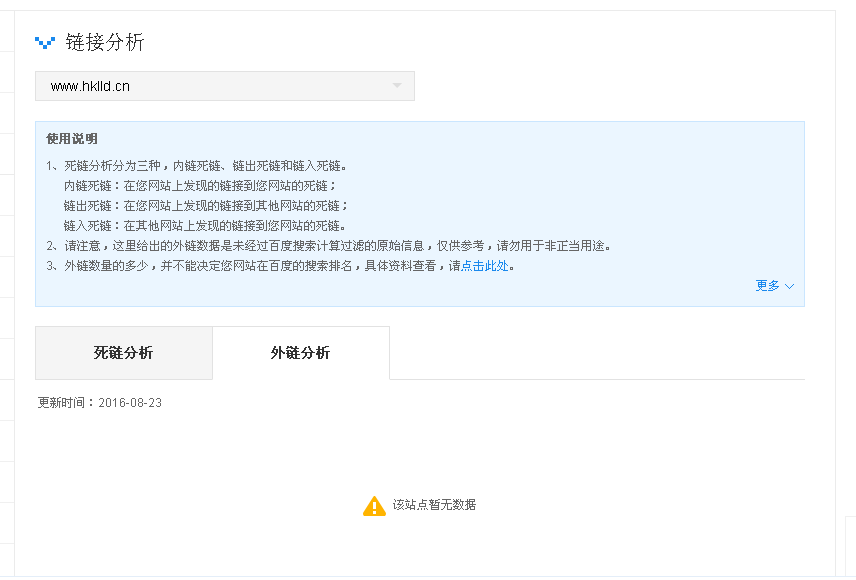我的网站http://www.hklld.cn百度外链分析数据一直停留在2016年8月13日,什么原因?