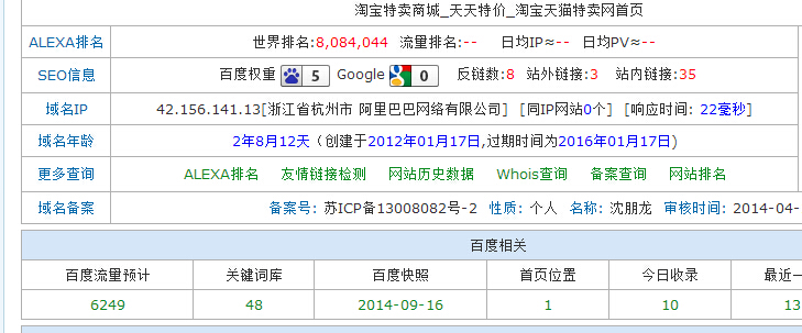 发现了一个权重5的淘宝客,内容不怎样,用站长工具查了外链没怎么做,但排名很好,大家来道出它的做法吧。网址是 yi020。com