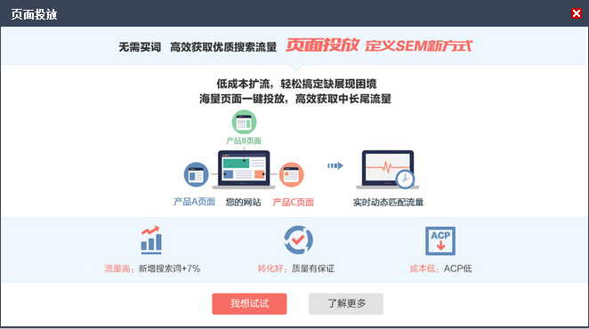 无需买词,提交主域下的子页面,系统即可基于页面内容定位相关流量,高效推广海量页面