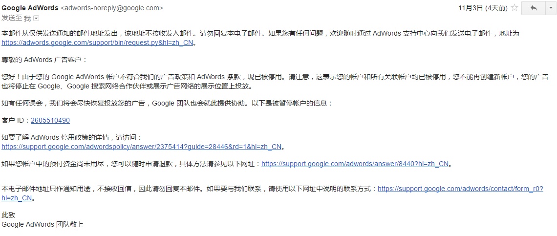 谷歌关键字广告开通投放也有2个多月了,最近网站和广告账户也基本没有做什么改动,突然之间谷歌发邮件过来说我的账户被停用了,做了以下尝试都没有得到解决: