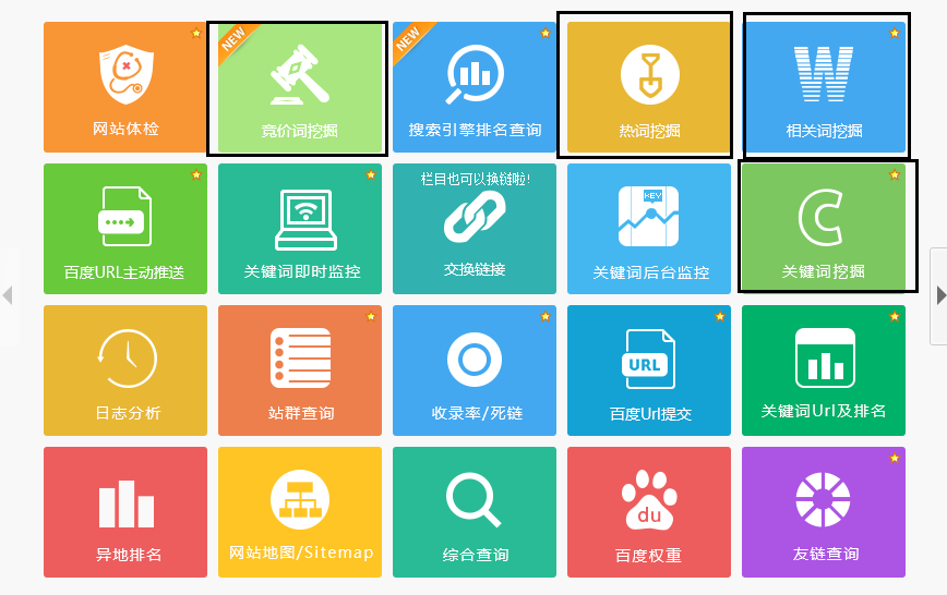 关键词挖掘可以查到百度指数、长尾词和移动转码,对于一些页面长尾词写法很好用