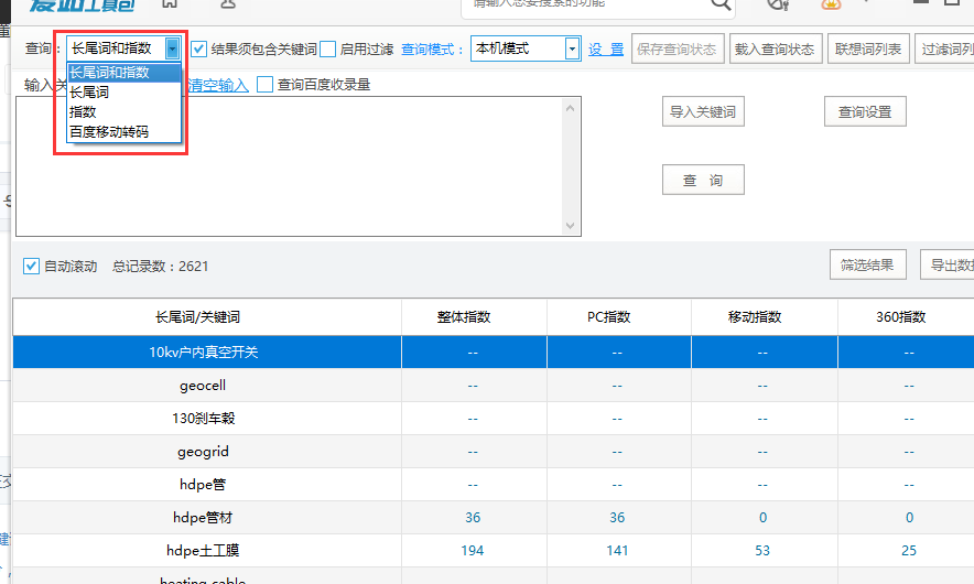 seo用的比较多的应该是相关词挖掘功能,我是做企业站的,布词这块用的比较多,可以查询到指数和长尾