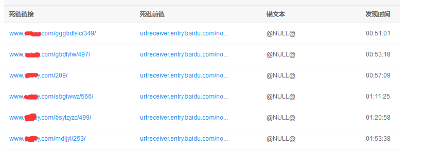 一直关注死链都是在内链死链和链出死链,这几天发现有很多的链入死链,死链前链是来自百度:http://urlreceiver.entry.baidu.com/normal.xml 锚文本@NULL[?]@ ,如下图所示: