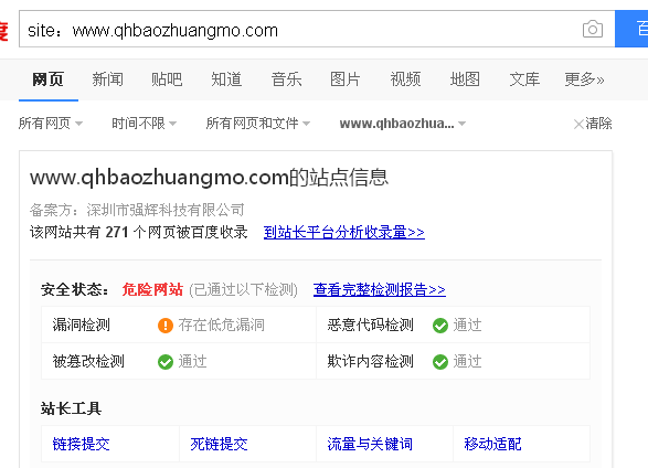 [导读]:site:www.qhbaozhuangmo.com,提示危险网站,截图如下 但是收录、排名一切正常,点击查看完整报告,出来一个网站安全检测,检测结果也正常 在这里你可以对这个企业网站认证一下...