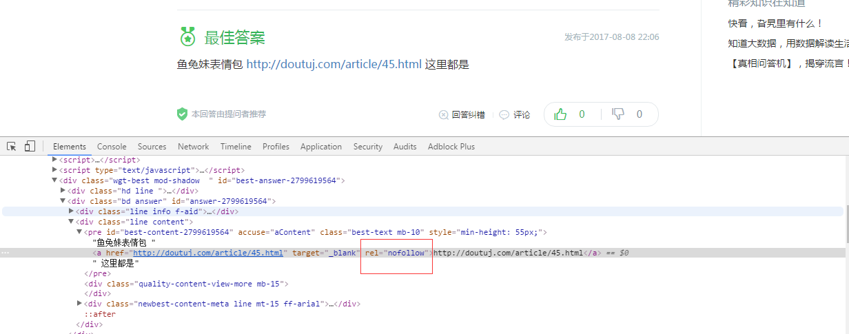 [导读]:网上关于在百度知道做外链是否有效的问题一直有争论,说百度知道会给链接加nofollow,这几天我发现一个问题 打开审查元素发现百度知道确实加了nofollow 但是我又通过查看源...