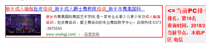 [导读]:首页地址:http://www.xxwhgj.com 关键词:新乡成人瑜伽教练培训 新乡成人爵士舞教练培训 新乡成人肚皮舞教练培训 PS:用爱站查询明明百度有排名 但实际搜索 却找不到网站的影子...