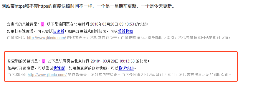 网站带https和不带https的百度快照时间不一样,一个是一星期前更新,一个是今天更新。