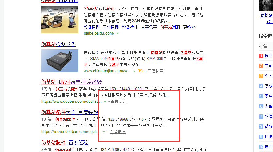 ###兄弟,他发的也被删除了,都是一样的。至于为什么你朋友会通过豆瓣找到他的广告,只能说,他一天24小时都在不同的换IP换账号的发豆瓣,豆瓣删了继续发,即使在几分钟之内删除了,但是他发的内容跟上了百度收录的速度,所以你搜某个词,他的广告就一直在百度首页。不知道这这样说你明不明白。(就是他在豆瓣发了东西,百度立马收录了,你朋友正好看到他的广告了。过一会豆瓣删除了他的广告,百度也取消了收录。这个期间他继续发广告,这样反反复复,你看看搜伪基站配件全是他一个人发的,而且现在豆瓣都删除了