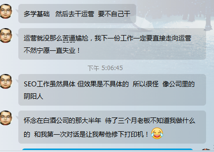 好像每个岗位都是迷茫的,包括技术,产品,运营等等。迷茫就是钱少,但是钱少并不是因为你做seo,seo也有很多发财的啊。就好比现在的那帮财团大佬们都是小学毕业搬砖的,不也成牛逼的人了吗,不照样做管理吗?迷茫是常态,如果一直没钱就一直迷茫,想不迷茫就得多赚钱,多赚钱的途径就是往公司中高层发展或者自己创业。底层的什么岗位都迷茫。