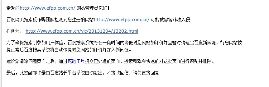 第五:后来百度站长平台发了一封邮件,说网站被入侵,具体情况如下;