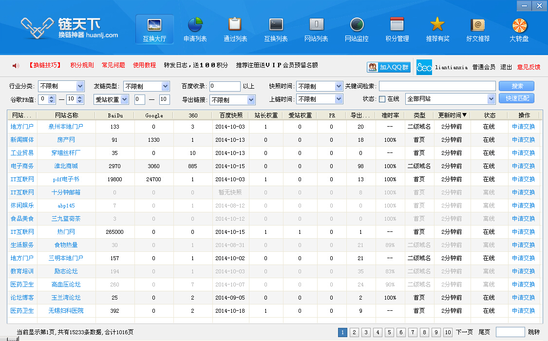 这个链天下客户端还不错,我现在每天都在使用嘞,公司的几十个网站都挂在上面嘞,每天会有人找我换链接。,我觉得最方便的方法,多加些各个行业的友链群,然后把这个信息往QQ群里面发送。推广