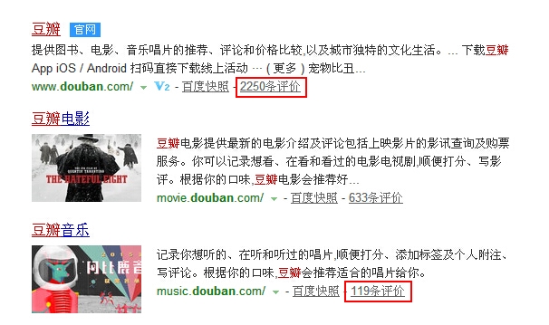 今天突然发现百度搜索结果中“百度快照”后面的评价变了,由之前的**%好评变为***条评价。如下图: