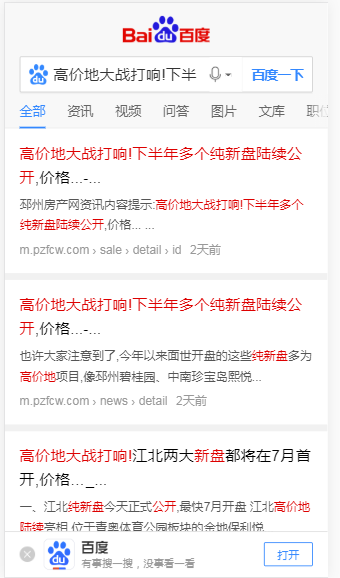 我知道是什么原因了,是你移动端伪静态化规则出了问题。移动端分别收录了(源代码的标题是高价地大战打响标题)和(源代码的标题请选择同盛广场4室2厅2卫1阳台)这两个网址,百度收录的标题都是高价地大战打响。。。一样的标题,你看看他们后面的参数都是29765,应该是你在弄伪静态规则的时候只对应了后面的参数,没有对应news和sale路径造成的。所以第二个网址调用了第一个网址的标题。如果我说的没错的话,如果百度收录了其他资讯页面如4或者3,那么等到百度收录了4和3这两个页面,他们的标题也是和上面参数29764和29763一样的标题,而不是二手房的