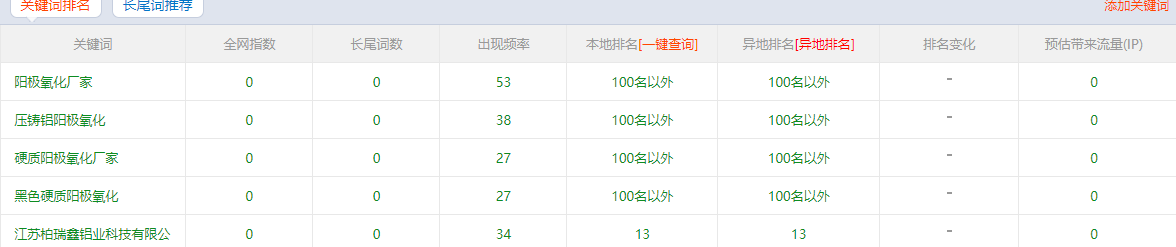 7、回归到网站的标题:黑色硬质阳极氧化厂家_压铸铝阳极氧化-江苏柏瑞鑫铝业科技 所选择的关键词目前是没有排名的,甚至用公司的全称去搜索首页,在百度页面前三页也是找不到首页,这说明什么?说明这个标题的选词是存在问题的。下图可以看出,反选择的关键词是比较冷门的。