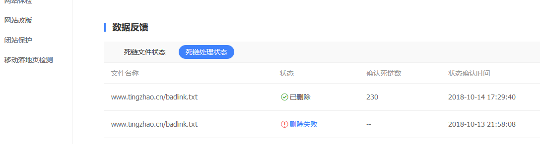 3、等待百度的抓取,抓取后在平台上的死链状态会出现删除字样,以及数量。
