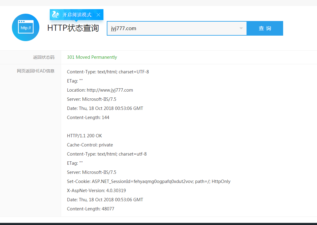 www.jyj777.com 为什么 我这个网站昨天在万网上面设置了301提示成功了 ,却在http 是200的状态呢? 我有点迷惑求老师们 给一个答案或建议。
