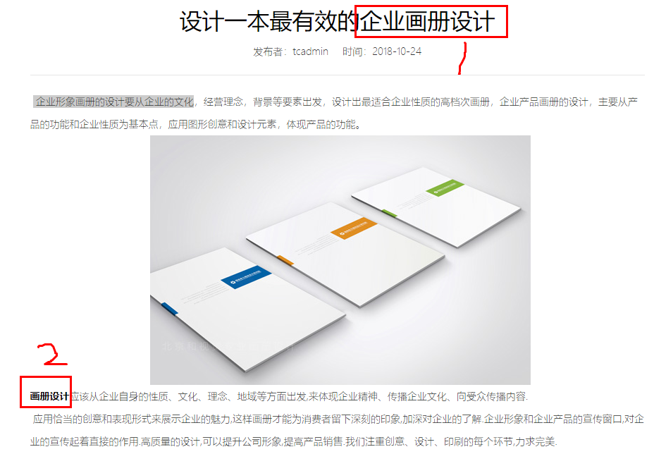 ,文章所设置的关键词和标题出现的关键词不一致,建议是在:“企业画册设计”这个关键词进行内链建设。链接指向前期可以适当指向到首页,慢慢之后可以将链接放到栏目页面或者案例具体页面。