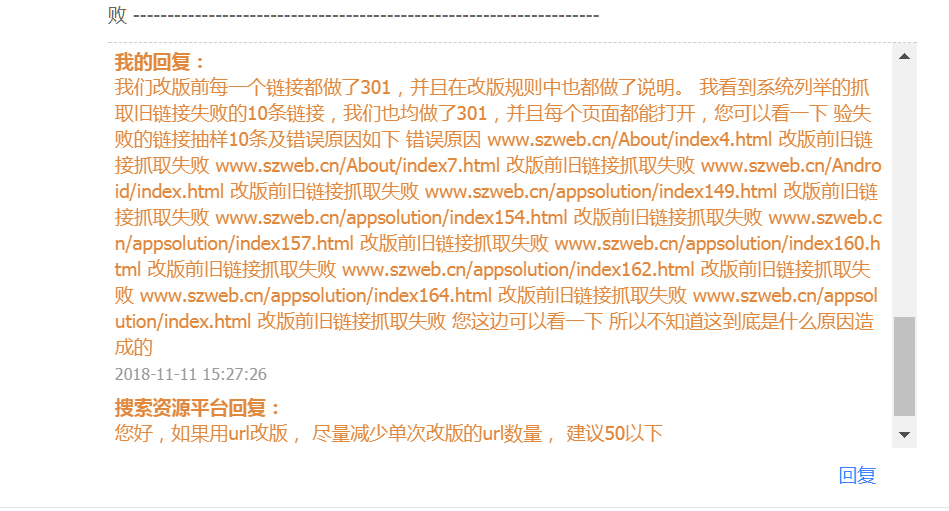 [导读]:网站改版3个月了,一直提示网站部分改版中,查询后百度提示是有相关页面打不开 并且列举了10条 但是我这边全部做了301,并且确保每一个页面都能打开,然后向百度询问应该...