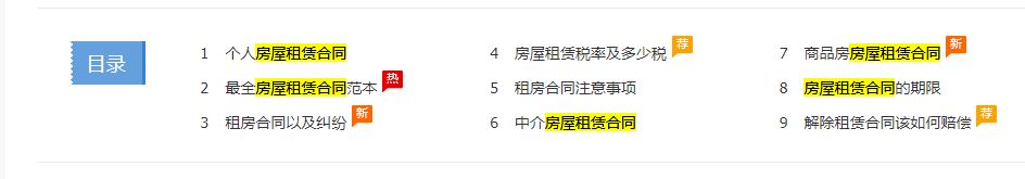 ###1、对于访问租赁页面可以适当的把内容增加,现在就只有6条说的是房屋租赁合同,你可以加到20条、30条,把各行业的访问租赁合同都写上去,北上广深全国300个城市都这么去加,这样就能拓展出很多页面,收录也能成倍的增长;2、还可以对应租房合同租赁的一些疑问也可以布局在这个页面里,这样就能丰富页面了。